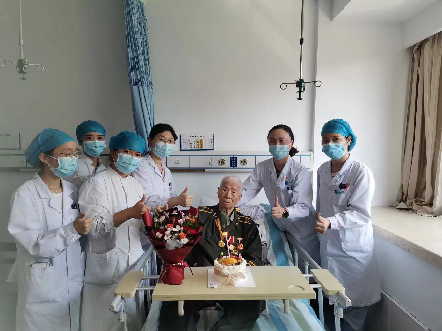 在科主任戴丽星的带领下,科室全体医护为病区所有党员患者送上党的生日祝福。患者盛奶奶今年已经93岁了,刚入院时奶奶的病情很严重,心衰、肾衰、严重感染……经过积极抢救后病情稳定。在恢复期间,科内医护除了关注奶奶的病情,也时刻关注着奶奶的精神和心理状况,奶奶睡不好,就通过药物去调节睡眠状态;奶奶的听力不好,为了让奶奶对治疗情况更加了解,每次查房时医护都是连说带比划;查完房后美小护还会给盛奶奶比个赞,鼓励其积极治疗。当戴主任和科内医护拿着鲜花、蛋糕走进盛奶奶的病房时,盛奶奶非常激动,连声表示感谢。