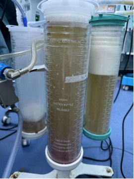 消化内科迅速将王女士转入妇产科。妇产科主任王中显高度重视,立即组织科内进行病例讨论,制定详细的手术方案。手术当天,在手术室麻醉科的全力配合下,王中显带领团队抽取囊液约4000ml,并完整取出大小约20×25cm的盆腔肿物。术中冰冻病理回报显示:(盆腔包块)纤维瘤伴囊性变。手术过程顺利,王女士术后恢复良好,最终痊愈出院。
