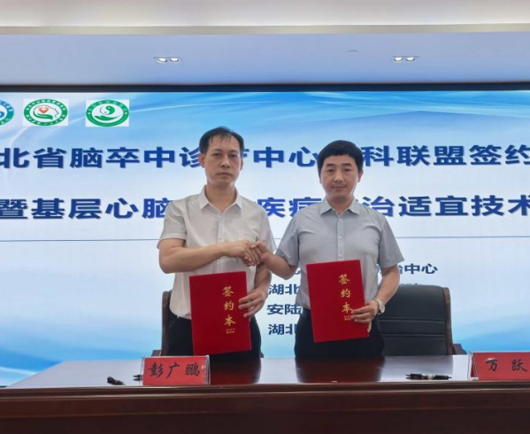 湖北中山脑血管病医院执行副院长万跃与安陆市中医医院院长助理彭广鹏代表双方签署合作协议