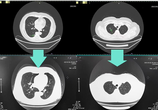 经过中医科 1 个月的精心调理,刘阿姨的咳嗽、胸闷及乏力症状得到了显著缓解。4 个月后复查肺部 CT,右肺结节较前明显缩小,部分结节消失。面对这一喜人的转变,刘阿姨激动不已:“困扰了我一年多的咳嗽终于好了,精神也好了,肺结节也消了大半,终于可以睡个安稳觉了。”(文:李倩)